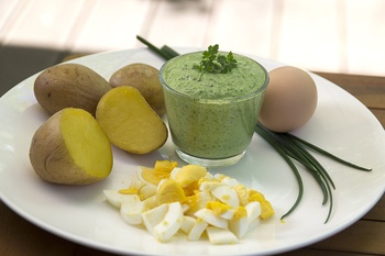 Die Frankfurter Grüne Soße ist eine Spezialität aus Hessen. Sie besteht aus Sauerampfer, Pimpinelle, Schnittlauch, Petersilie, Kerbel, Kresse und Borretsch. Hier das Rezept für die sogenannten gesunden Sieben.